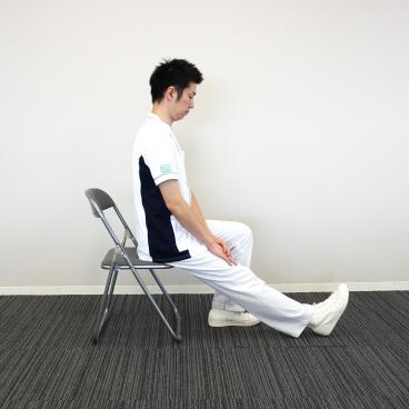① 安定した椅子に浅く座り、片足を伸ばします。