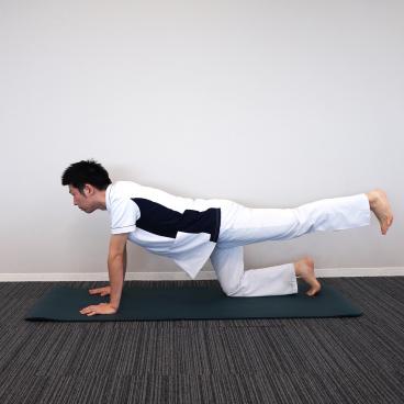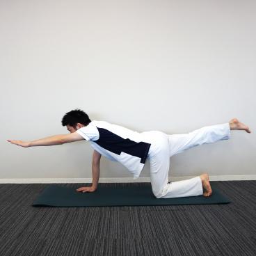 ② 体が水平になるように、対角にある手足をゆっくりと上げます。