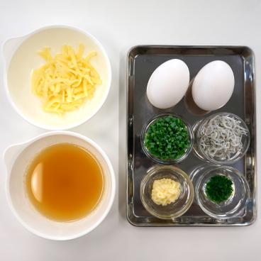 ①ボウルに卵を割ってよく混ぜ、マヨネーズを加えて混ぜたら、ピザ用チーズ、しらす、万能ねぎを加えさっくりと混ぜる。