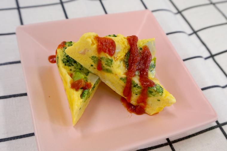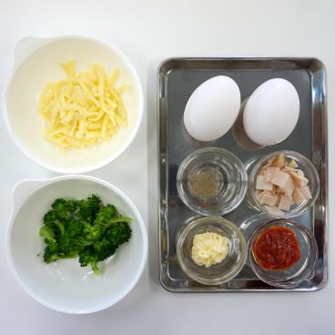 ③レンジにかけて小さく切ったブロッコリーと、さいの目に切ったハムを②の卵液に散らす。