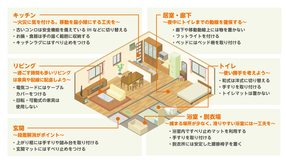 一度にすべての対策をとることは難しいと思いますが、「一番不安だな」というポイントから一つずつ対策を考えてみてはいかがでしょうか。また、掃除機などの頻繁に使用する家電はコードレスのものを選んだり、電球が切れたらすぐに交換する、すべりやすいスリッパや室内履きを避けるなど日常生活について見直すのも大切ですね。