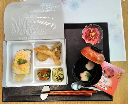 押し寿司は彩りも良く食べやすく、天婦羅は長崎風の天ぷらで少し甘みがあり、サクサクで美味しいかったと喜ばれました。