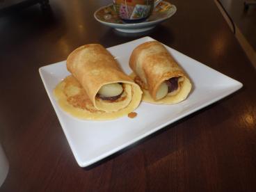 薄く伸ばした生地に、あんことフルーツを乗せてクルクル。