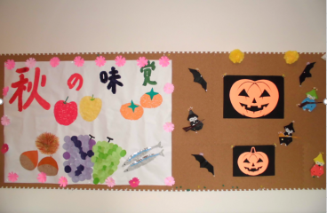 ツクイ・サンフォレスト川崎麻生のサンフォレストギャラリーはすっかり秋になり、皆様と楽しくちぎり絵を作成して、美味しそうな食材がたくさん出来ました。ハロウィンの準備も少しずつしています。