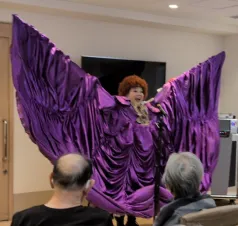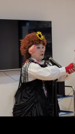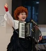 アコーディオンでオペラを弾き語り、音楽でコメディを創造する「みま」さんのパフォーマンス。