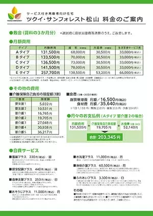 | 月額費用 | 160,360円~286,560円 ※入居一時金なし、 敷金は賃料の3ヶ月相当分 |