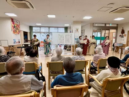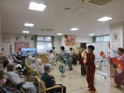 併設のデイサービスでは、毎月恒例の「赤坂コーラス」の皆さんによるイベントを開催しております。毎月思考を凝らした「踊り」「劇」「歌」などで、お客様を喜ばせてくださいます。