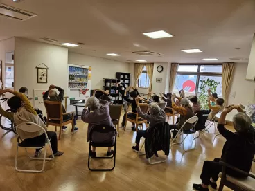 週3回開催している体操の時間には、沢山のお客様が参加してくださっています。9月までは午後の時間に開催しておりましたが、10月から時間を変更し午前中に行っております。時間を変更したことにより、参加して頂く方が増えたように思います。