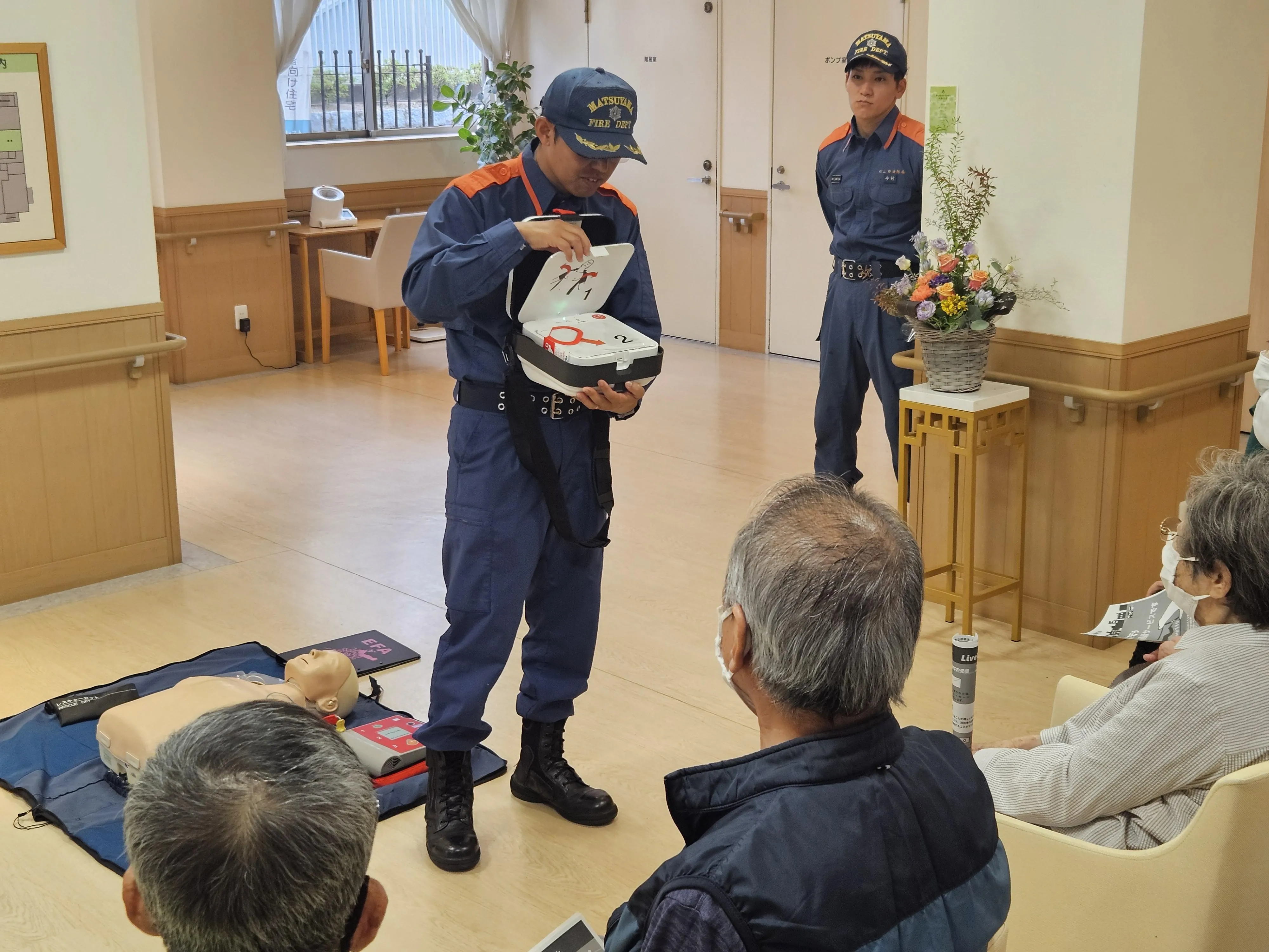 事務所受付カウンターに設置しているAED(自動体外式除細動器)について、正しい使用方法や緊急時の対応を学ぶための講習会を開催しました。講習は、松山市消防局中央消防署の職員の方を講師にお迎えし、お客様とスタッフを対象に行いました。実際に人形を使って胸骨圧迫を体験し、「AEDの使い方が分かって安心した」「心臓マッサージは思ったより力が必要だった」「実際に体験できてよかった」などのお声がありました。