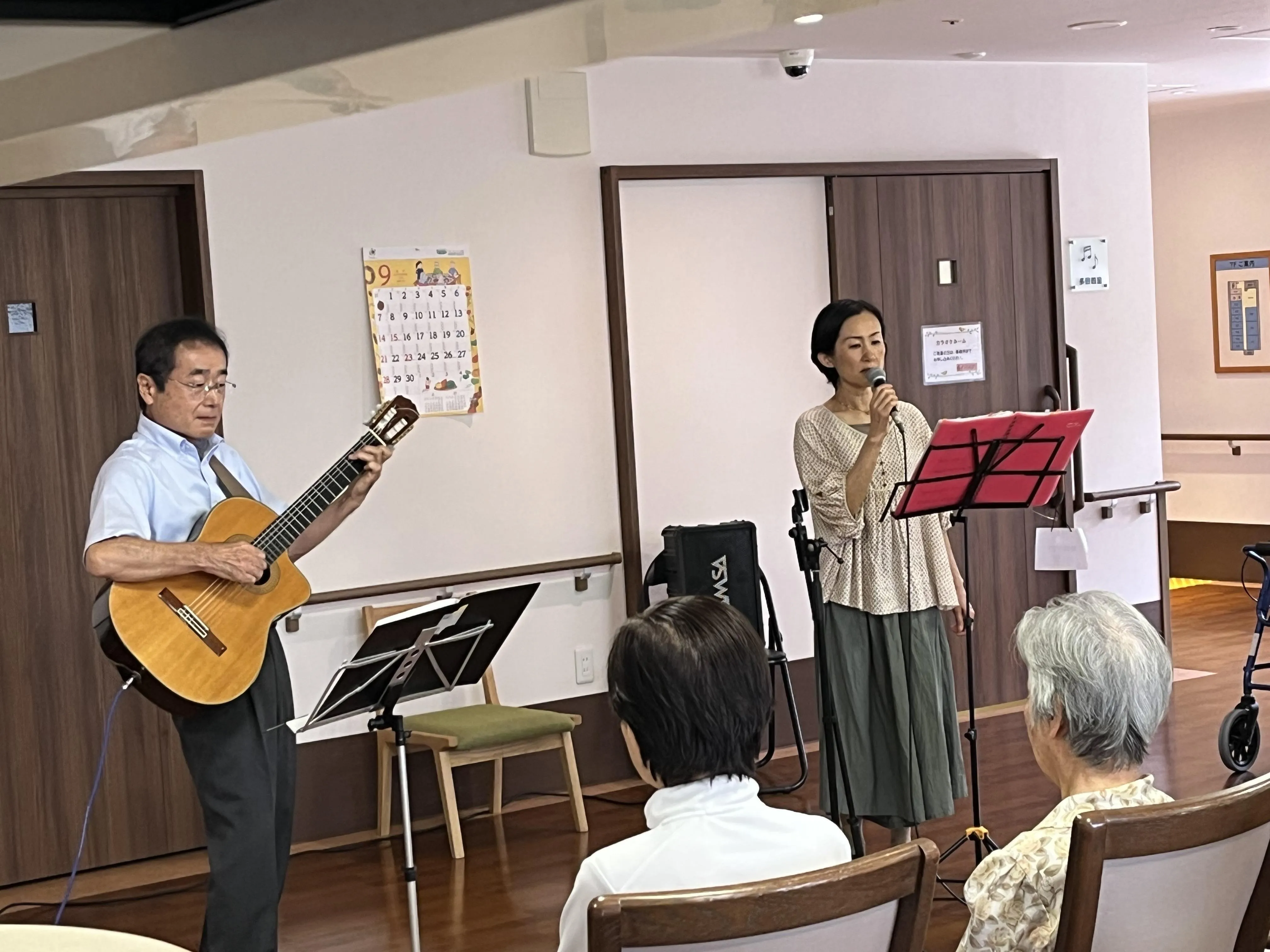 優しいギターの音色と心に響く歌声に、会場は温かい雰囲気に包まれました。演奏の途中では、お客様と一緒に「上を向いて歩こう・ふるさと」を合唱する場面もあり、懐かしいメロディに笑顔が広がりました。