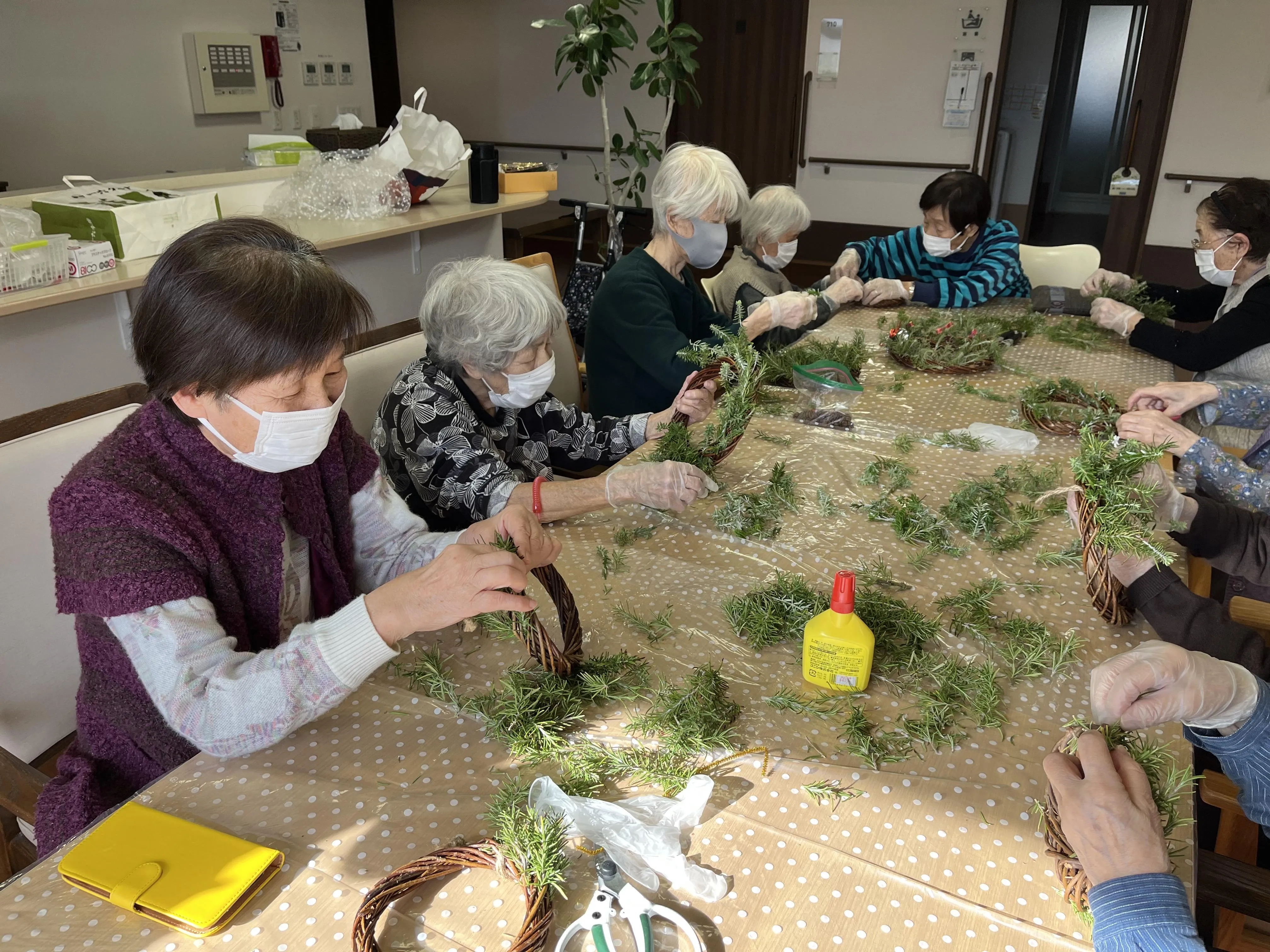 玄関のプランターで育てているローズマリーを使って、リース作りを楽しみました。ローズマリーの爽やかな香りに包まれながら、お客様それぞれが思い思いの飾りを選び、世界に一つだけのリースを完成させました。