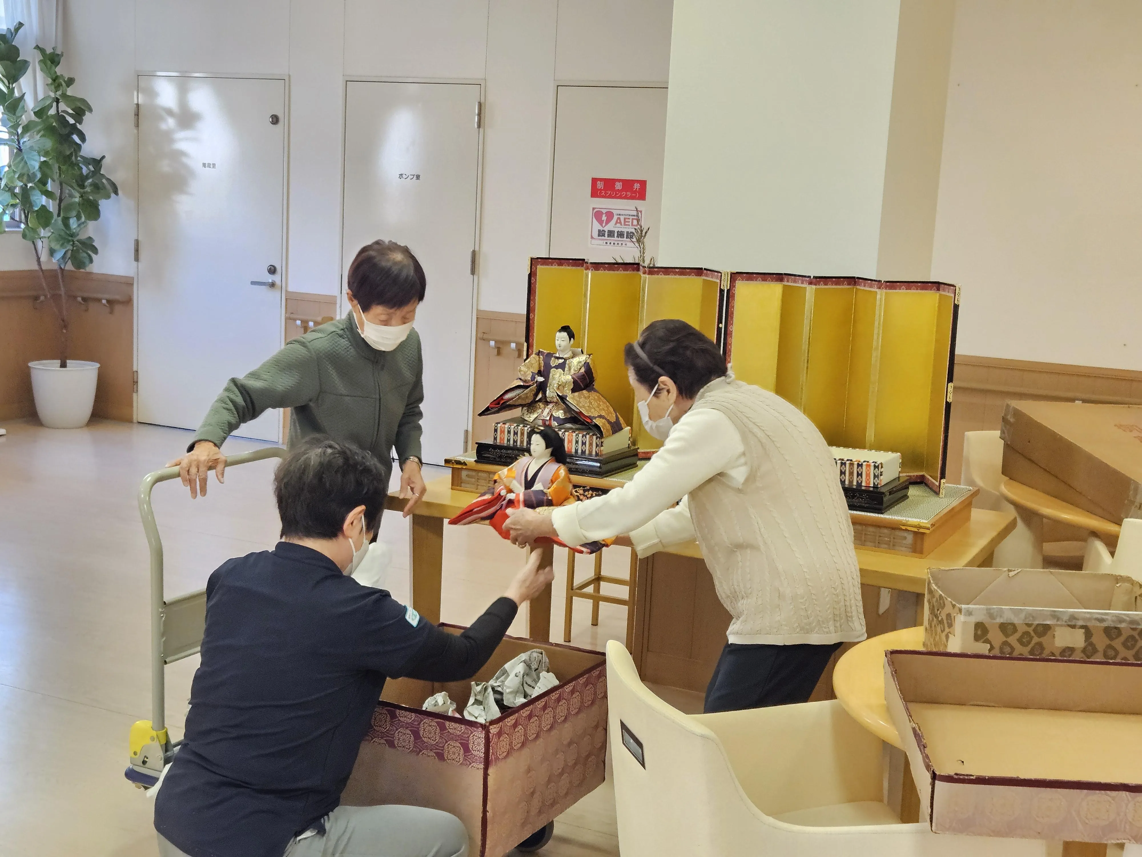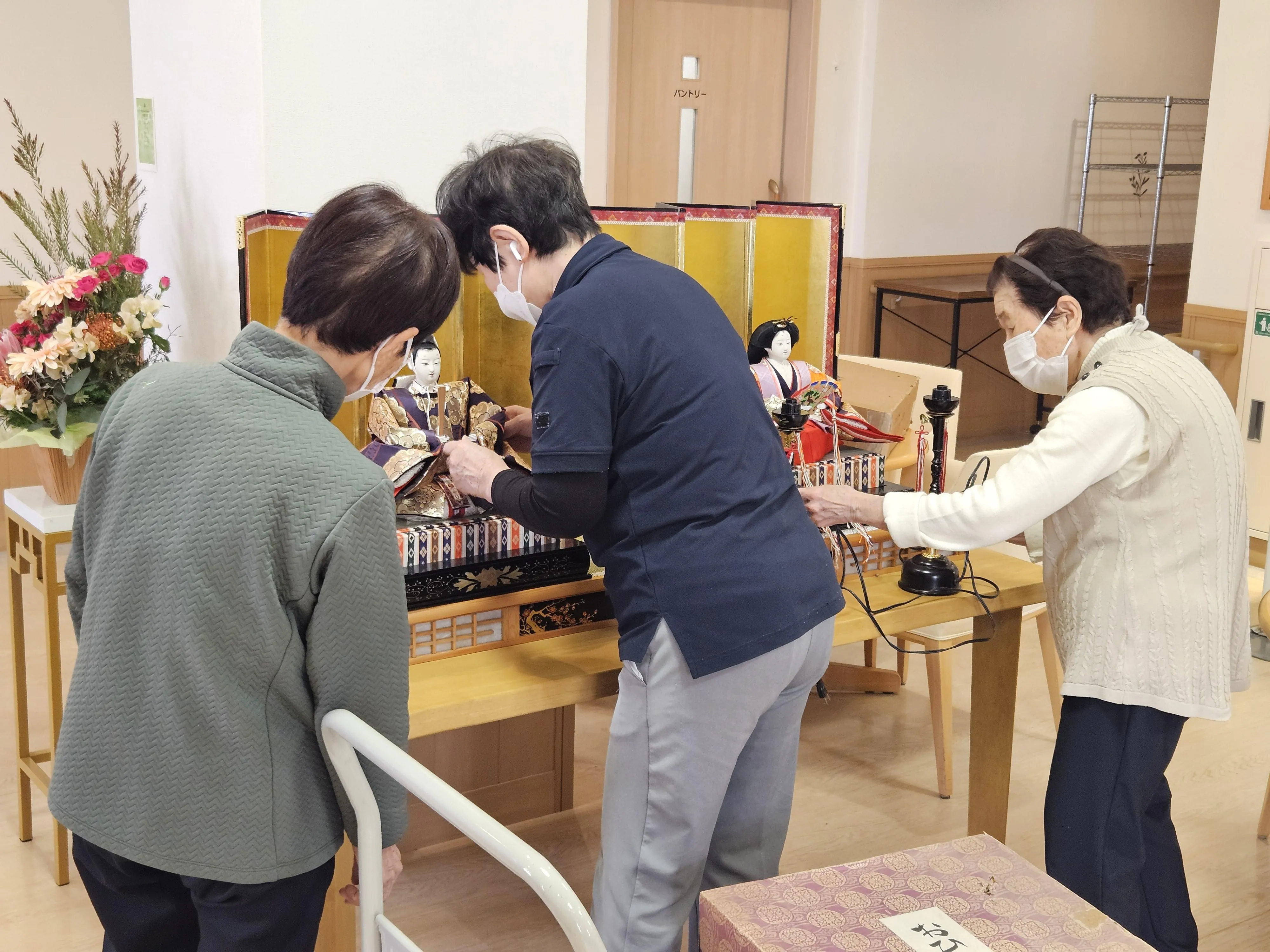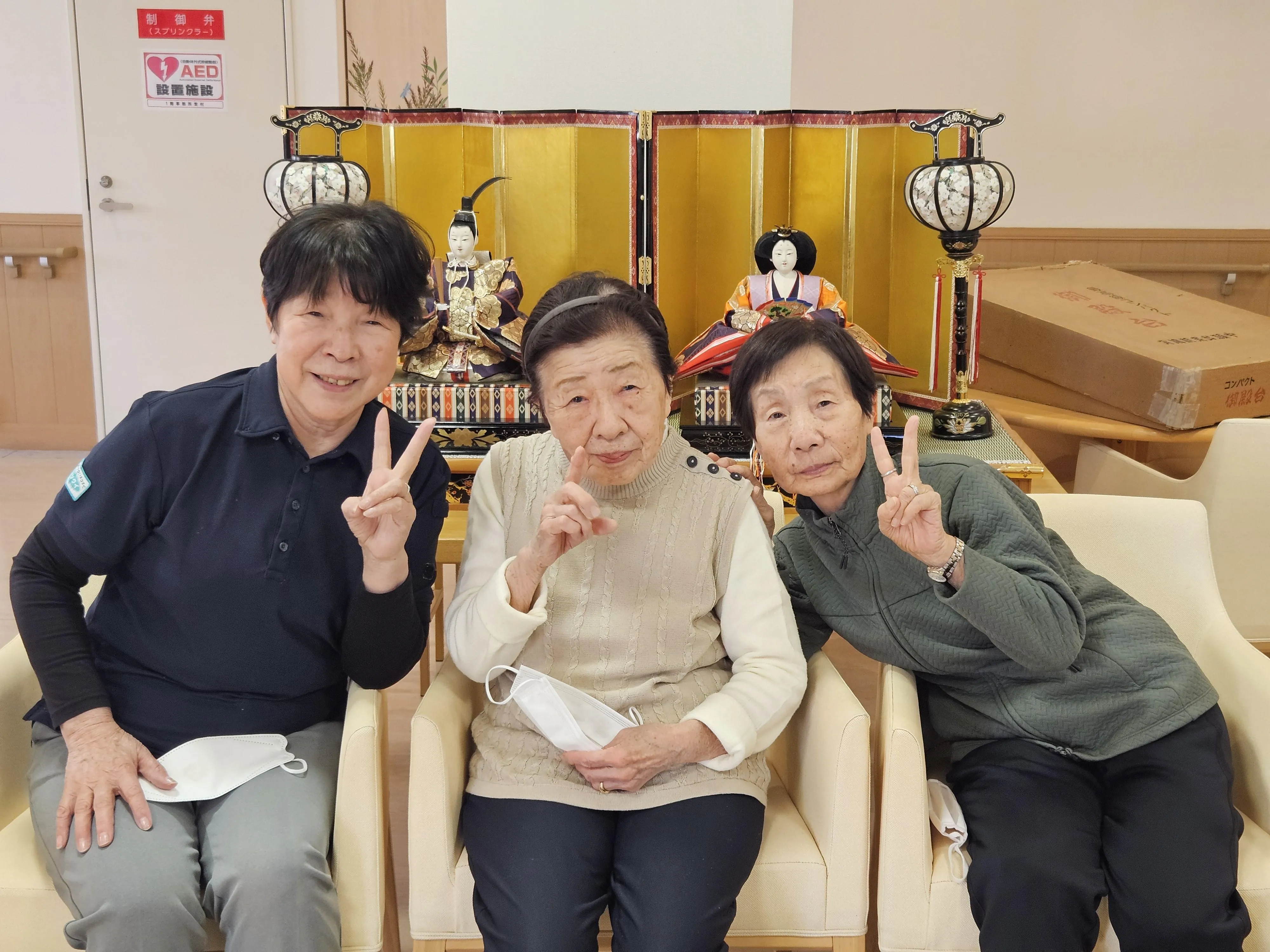 華やかに並んだ雛飾りは、施設の入口を一気に春色にしてくれました。
