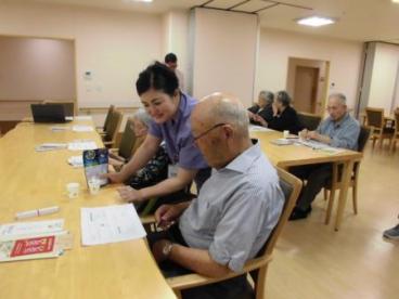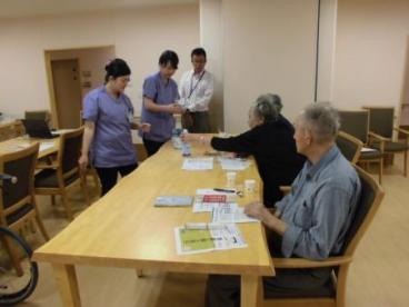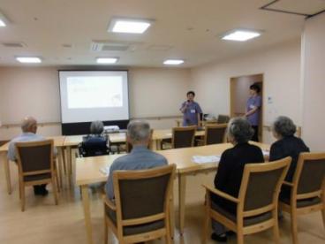 訪問看護ステーションふうりんの管理者:佐野理恵先生を講師にお招きして、「元気を創る講座」を開催しました。入居されているお客様に、ご自分の健康管理を主体的に行って頂こうという趣旨です。