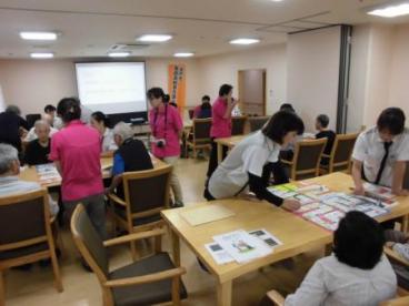 昨年に引き続き、水戸市東部高齢者支援センターの皆様にご協力頂き、認知症サポーター養成講座を開催しました。教材として活用されている「認知症456(すごろく)」は、体や頭を働かせて楽しみながら認知症を学べるように構成されています。当事業所のスタッフも地域の皆様と一緒に制作段階から関わらせて頂き、とても愛着のあるアイテムです!