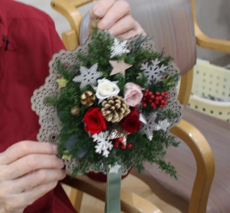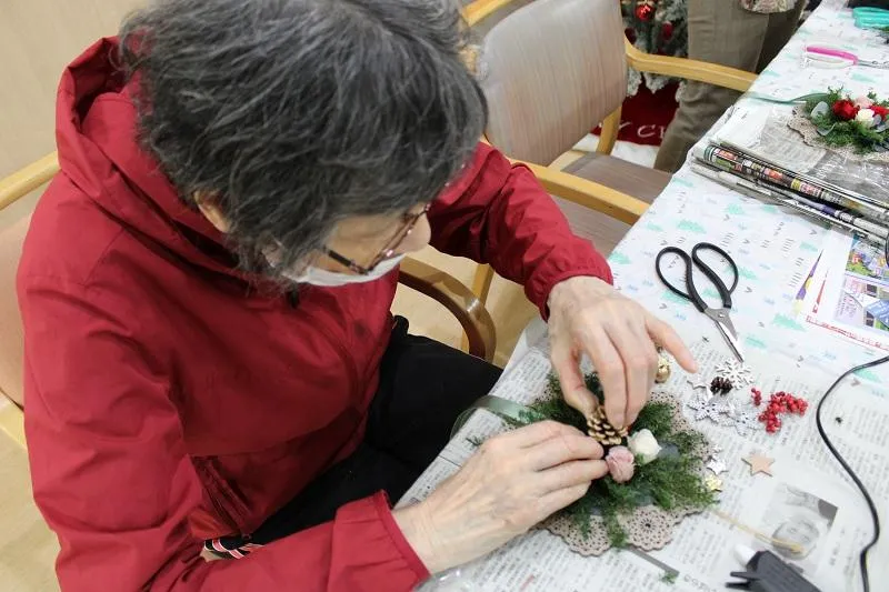 11月23日に、クリスマスのリース作りを行いました。先生に指導していただきながら、グルーガンを使い、細かい飾りを立体的に盛り付けていきます。