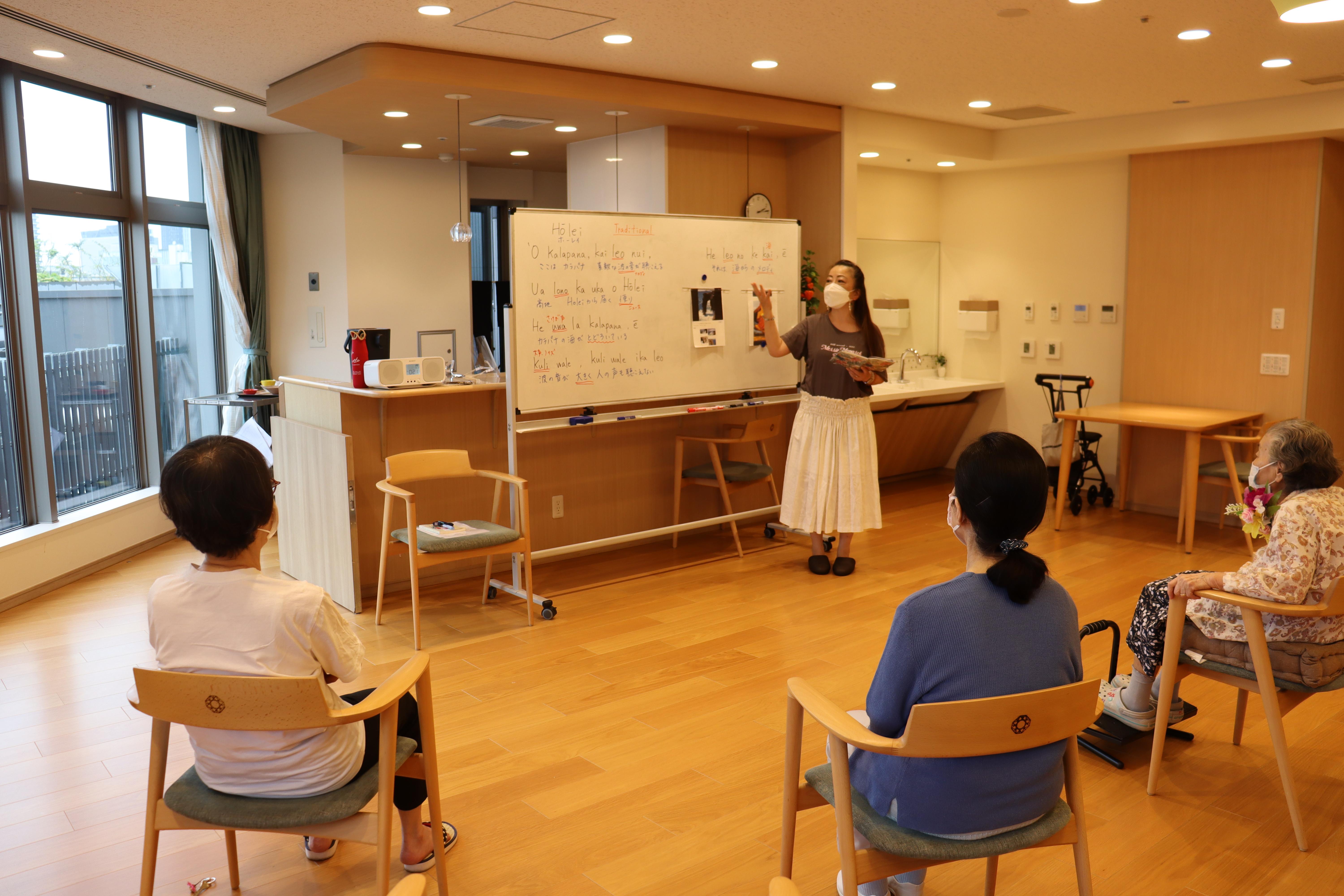 始めに、ハワイの景勝地を写真を交えて紹介していただき、次に、本日教えて頂く『Holei』を曲に合わせて踊っていただきました。