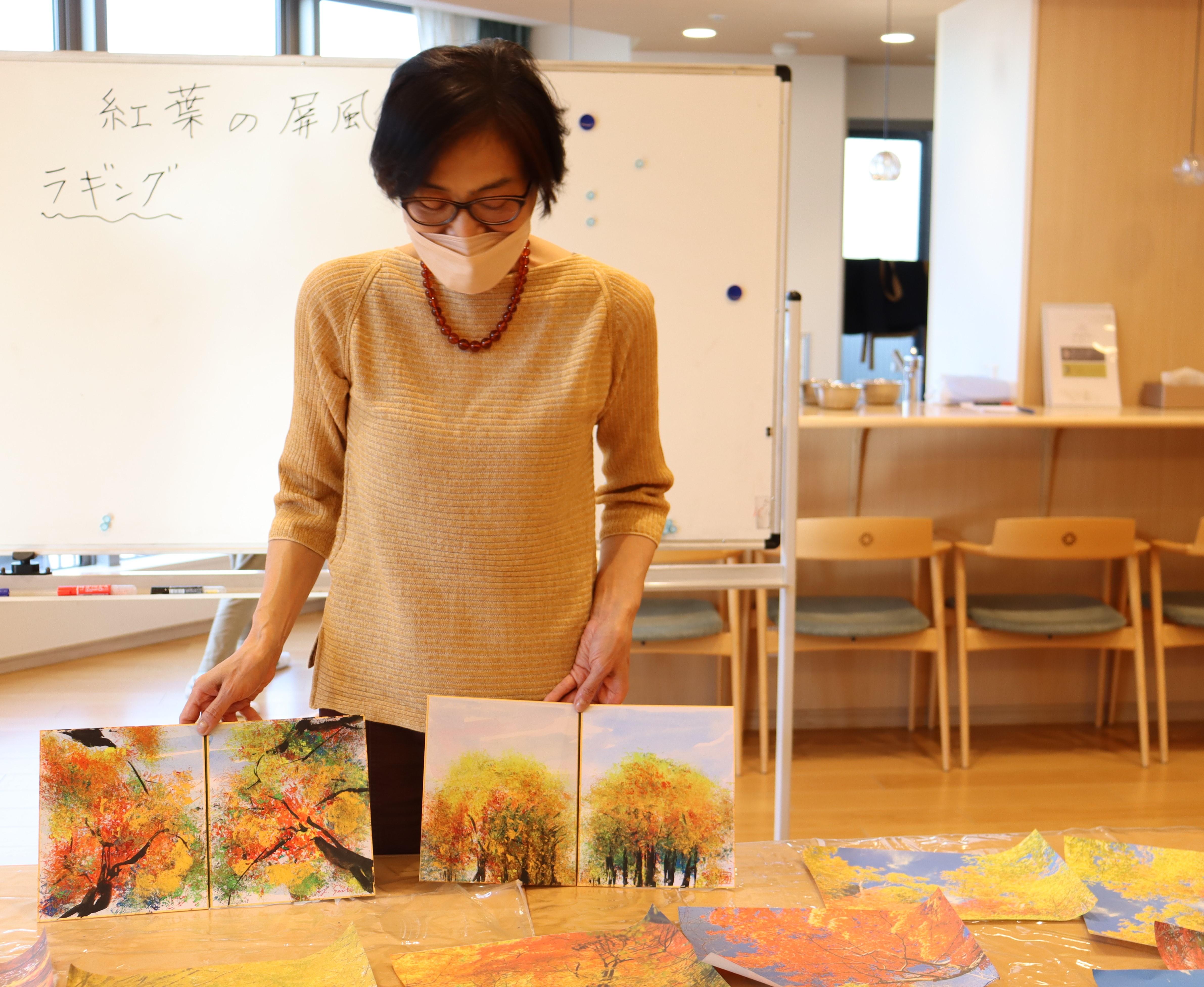 絵具を使い、ラギングという手法で紅葉の屏風を作っていきます。