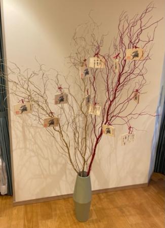 午後からは「絵馬に願いを」と題したイベントを開催。ののあおやまの氏神の金王八幡宮から取りよせた絵馬に思い思いの願い事を書いていただき、色付けされた雲竜柳に絵馬飾りを行いました。