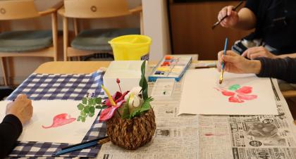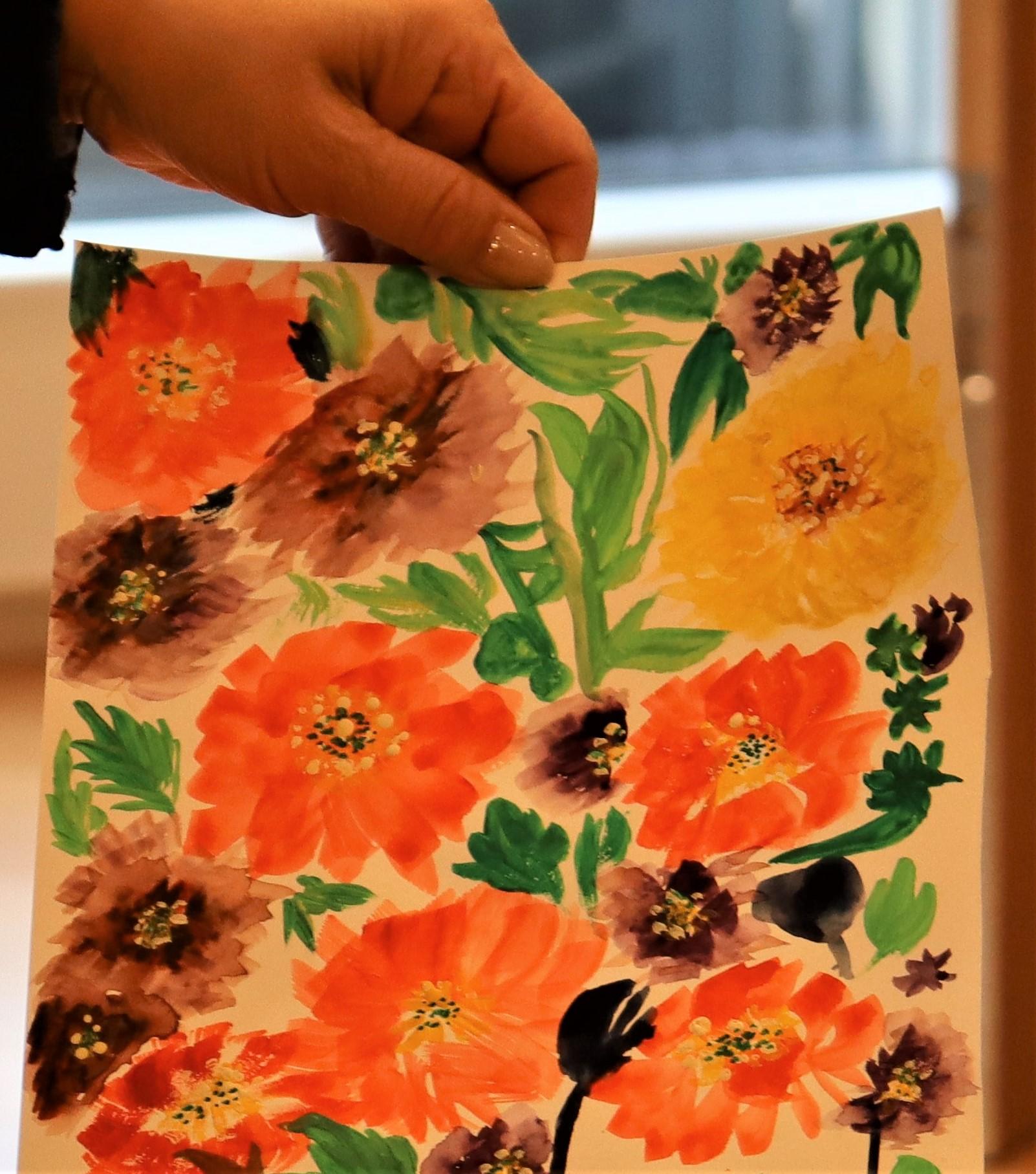 皆様のご希望で、【お花】を水彩画の書初めにしました。今の流行りは、POPなデザインと講師が説明されていました。