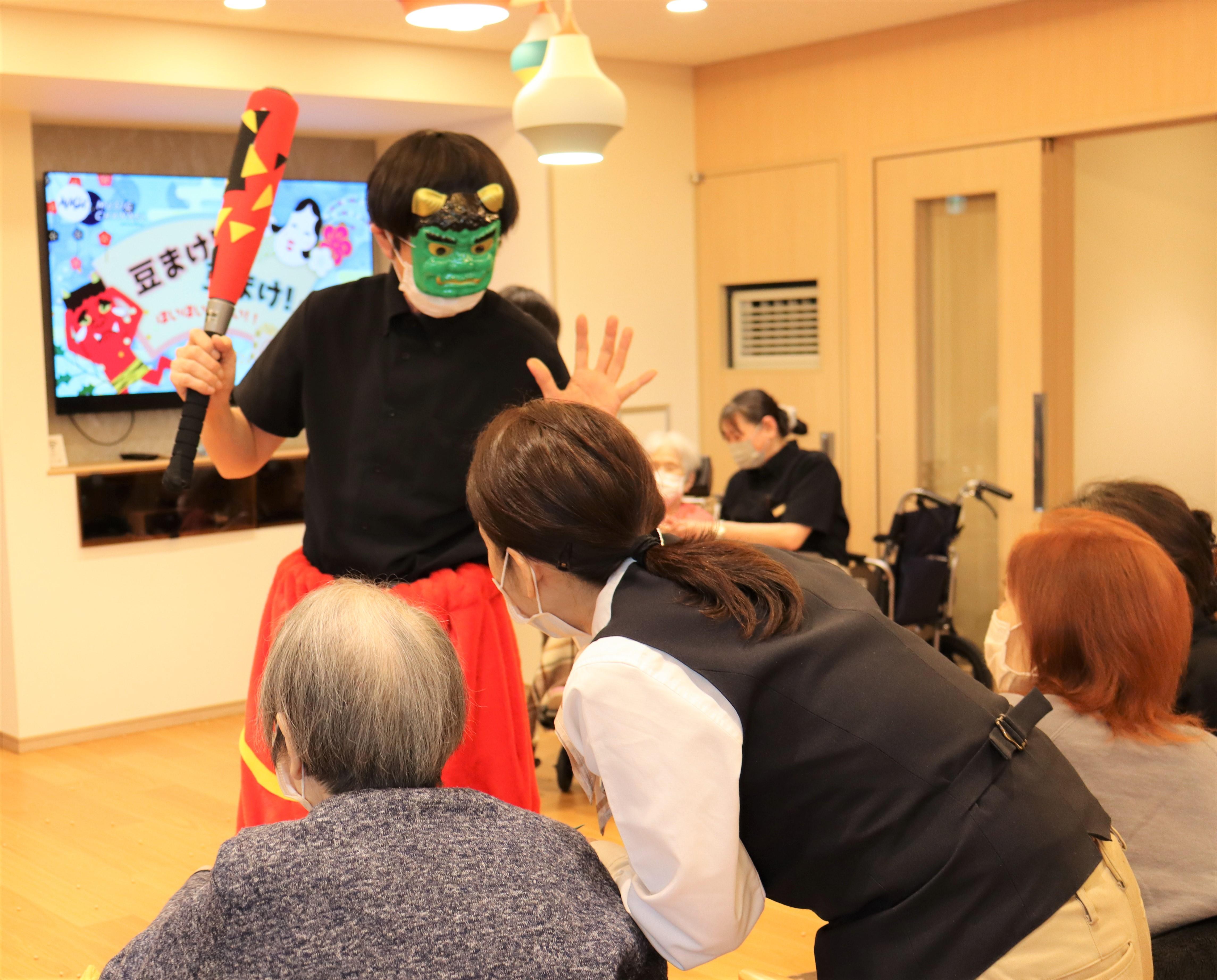 お優しい皆様は、スタッフ扮する鬼に、本当にそっと豆を投げていらっしゃいます。