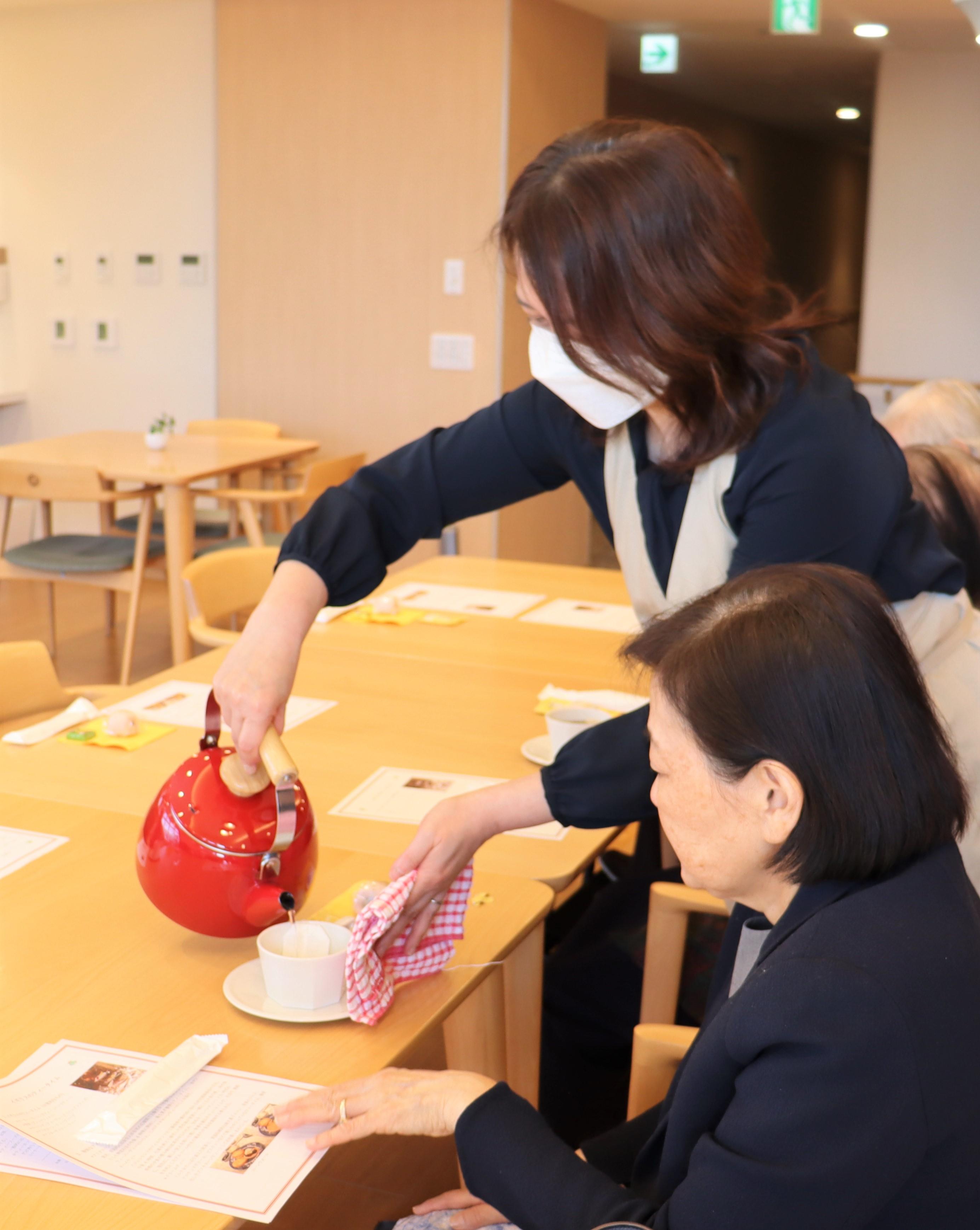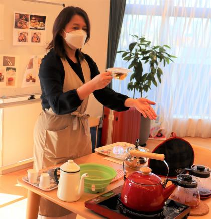 まずは簡単に淹れたものと、しっかり4分間蒸らしたものを飲み比べます。皆さま、「しっかり蒸らした方は香りが良いわ」「味に深みがあるわ」と違いを感じておられました。