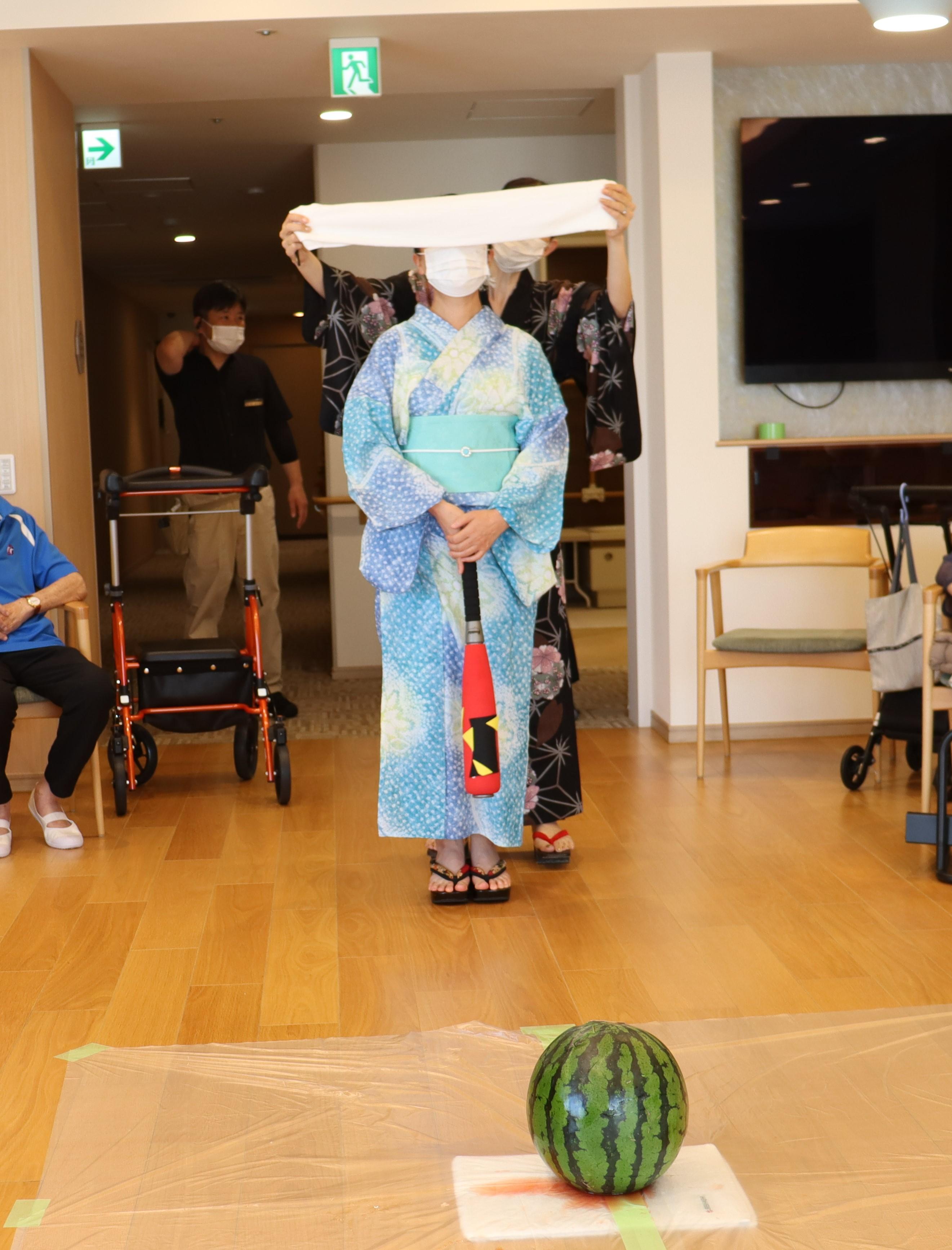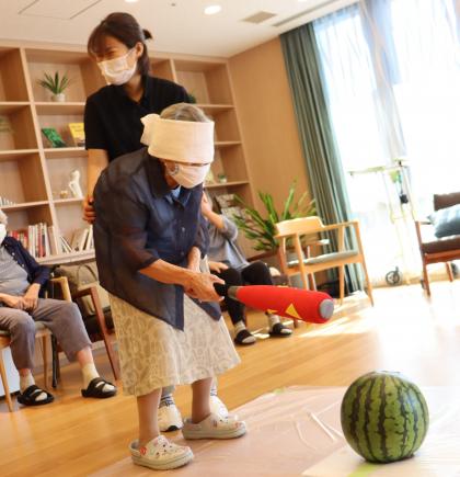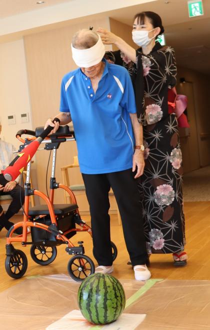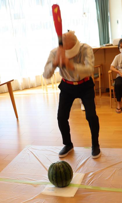 ご入居の皆様が目隠しをして、大きなスイカの前でバットを構えています!!
