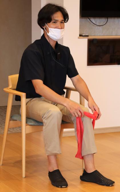 佐藤機能訓練指導員が「この動きは毎回取り入れます。次回から誰が一番早いか、競争しますよ!」
