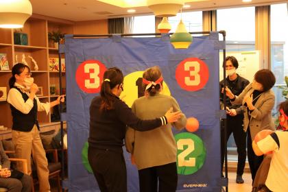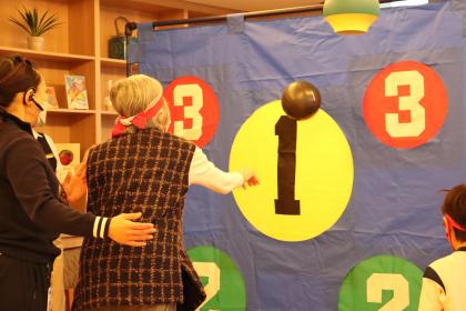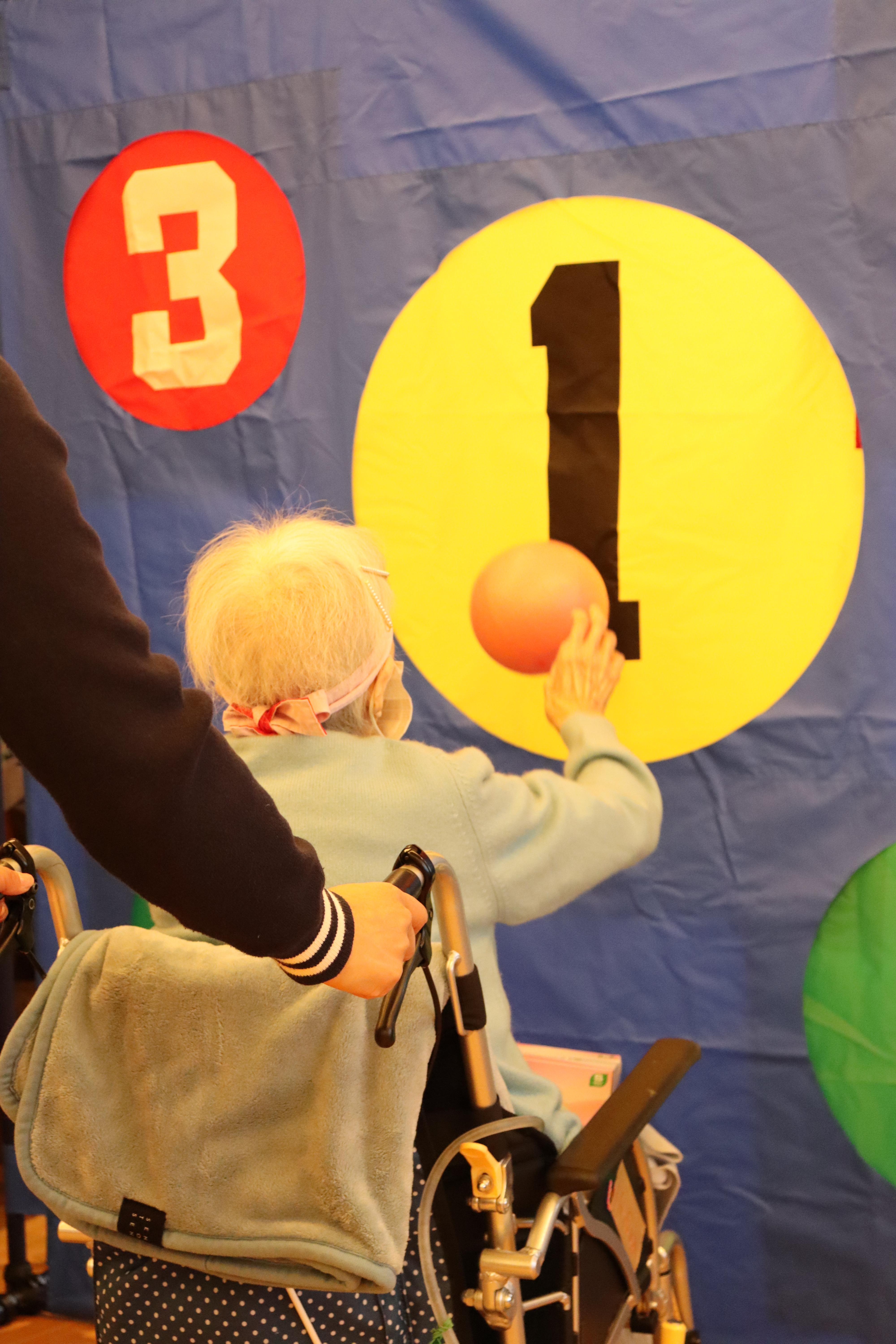 その方に合わせた飛距離を考え、ゴムボールで的を狙います。
