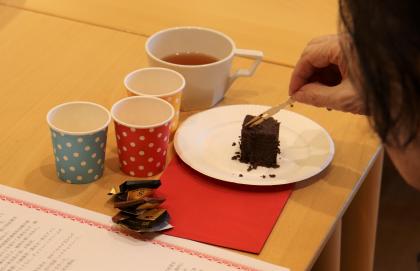 チョコレートの歴史などの講義を経て、お楽しみのティータイムはチョコブラウニーをお供に。