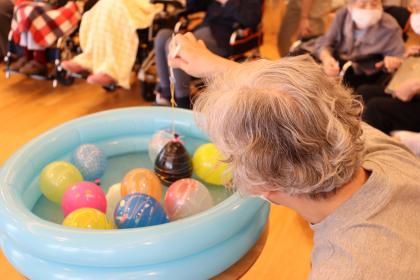 お好きな色のヨーヨーに狙いをつけて、ゆっくり吊り上げます。