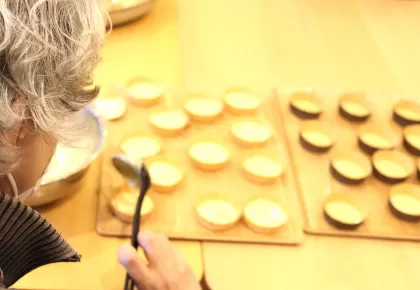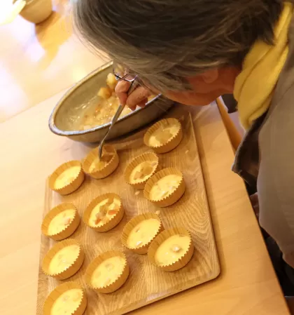 型に生地を入れる担当や、飾りつけのコンポートをトッピングする担当など。