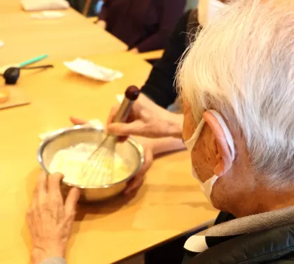 泡だて器で生地を混ぜるのは、男性陣にお願いしました。