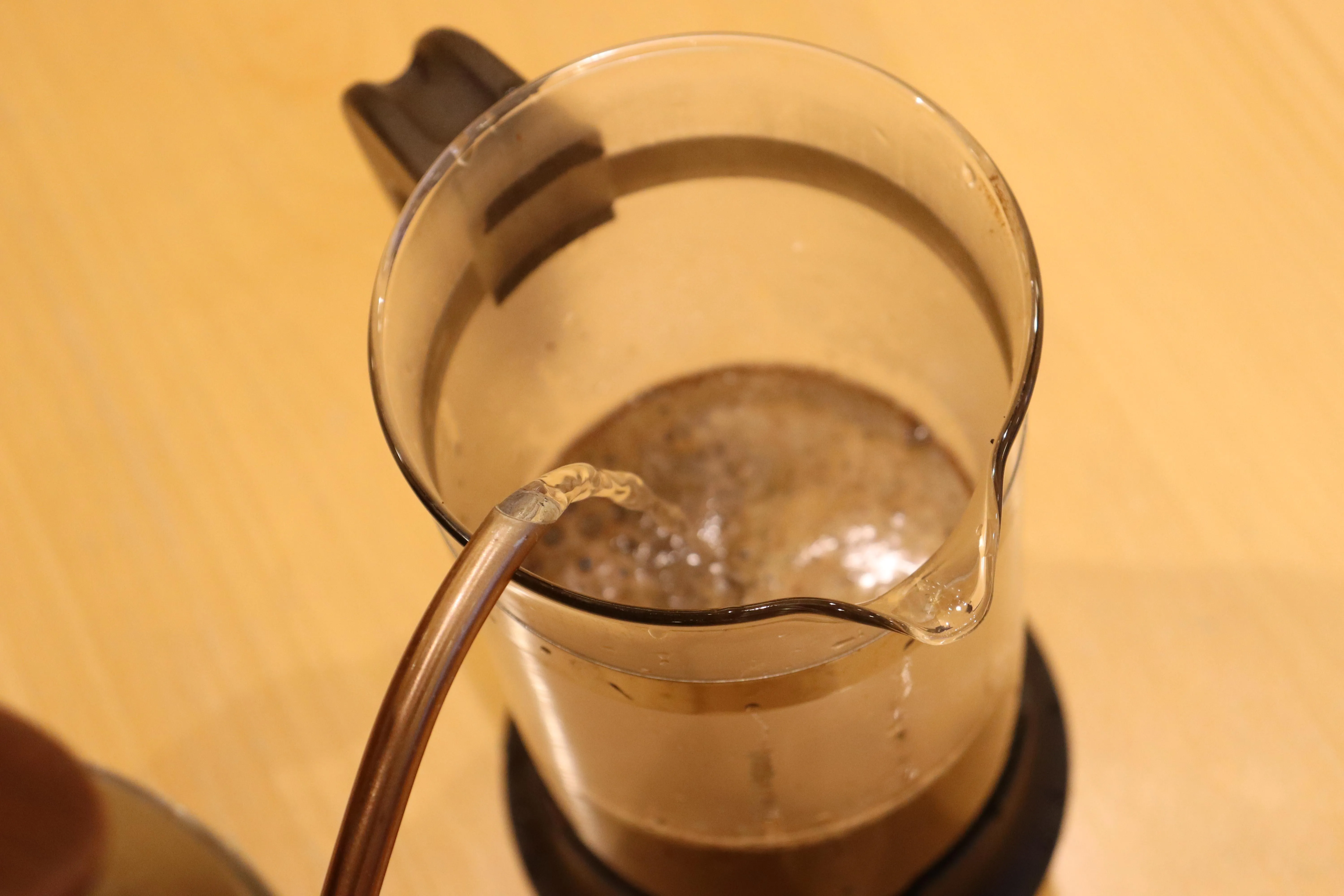 「お湯を注ぐときに泡立つ泡…アクではありませんよ。これは珈琲のアロマオイルです!」と講師。