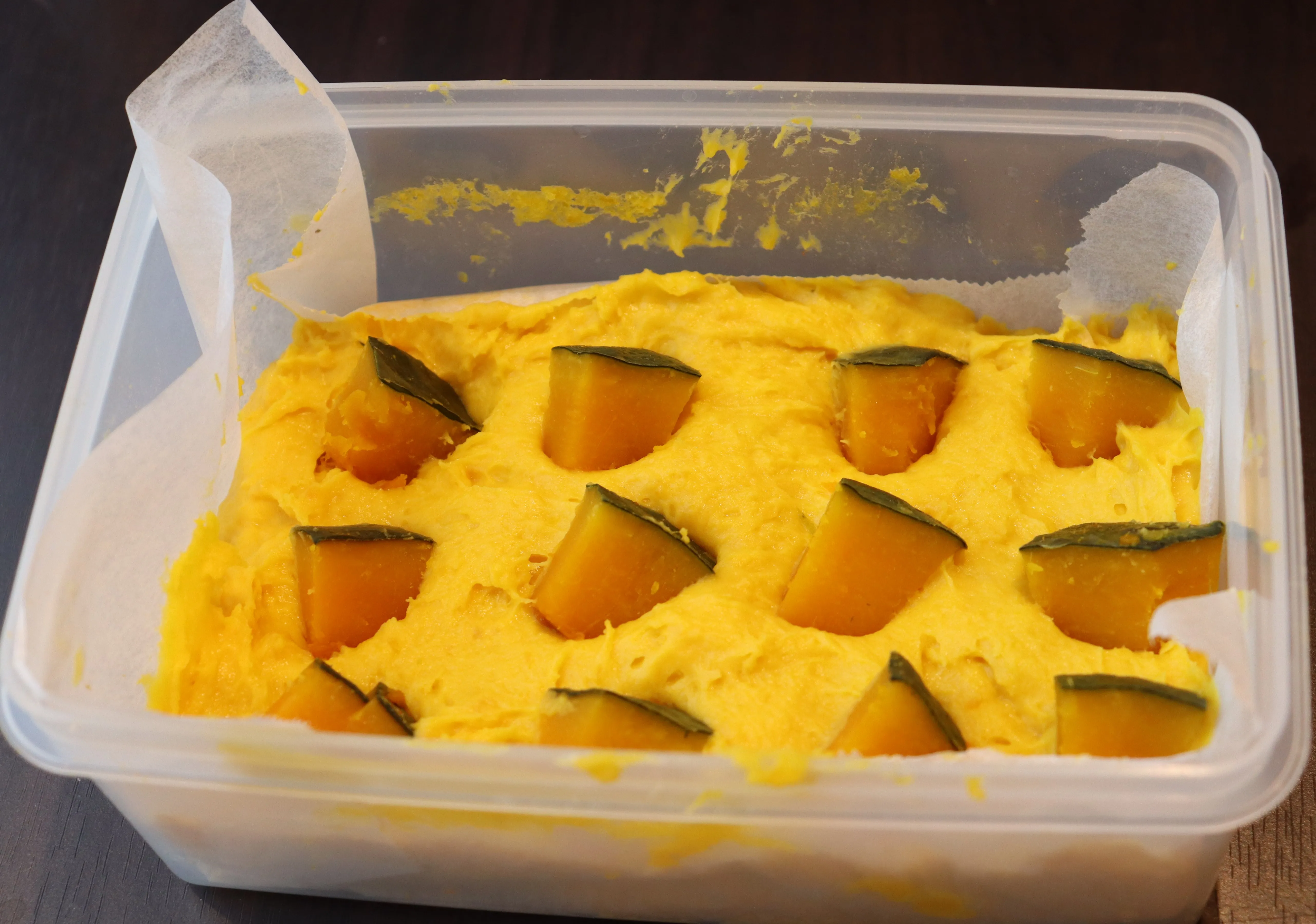 容器に流し込み、かぼちゃのトッピングをのせて。