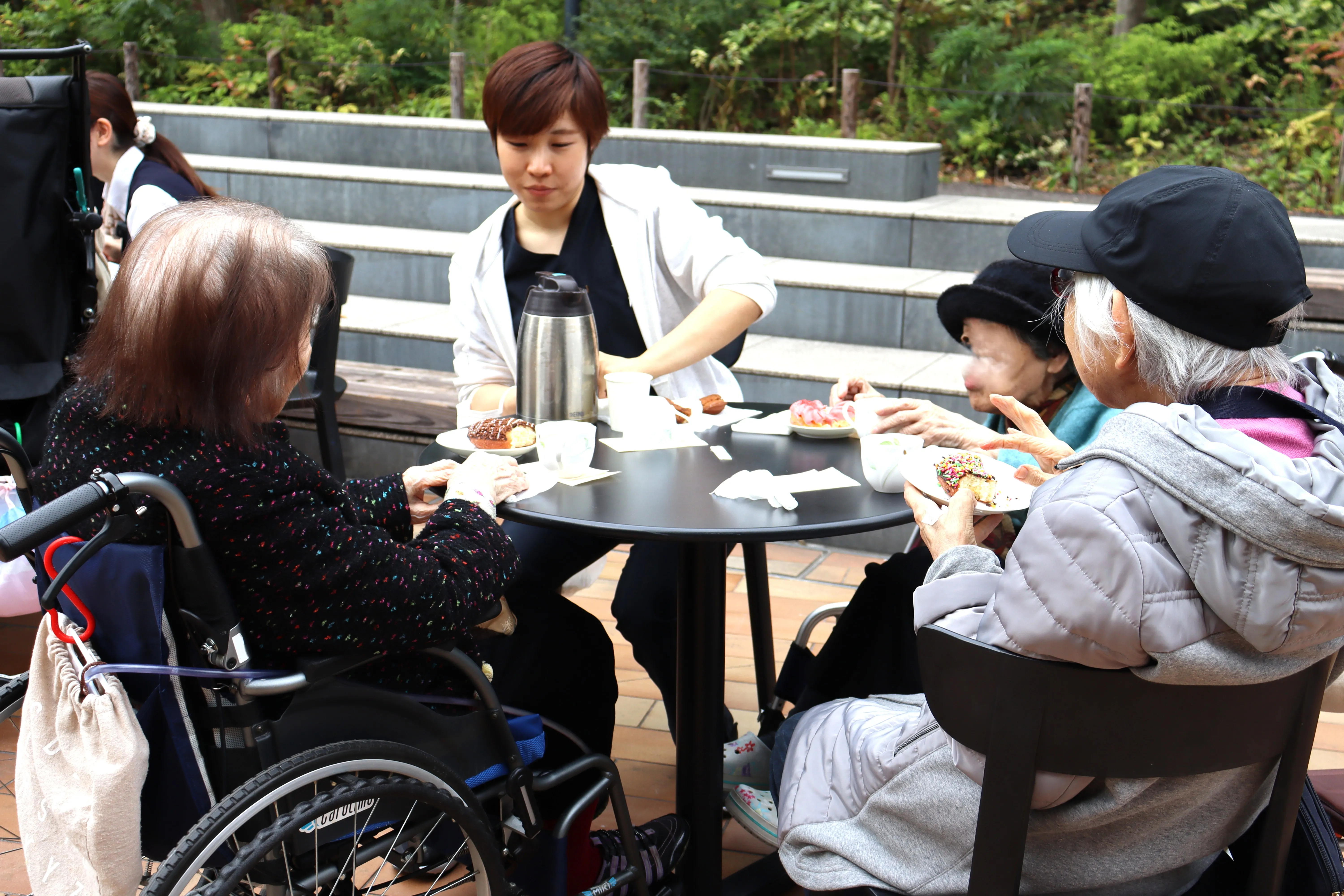 大勢の参加者に交じって、スタッフも一緒にドーナツを頬張ります。