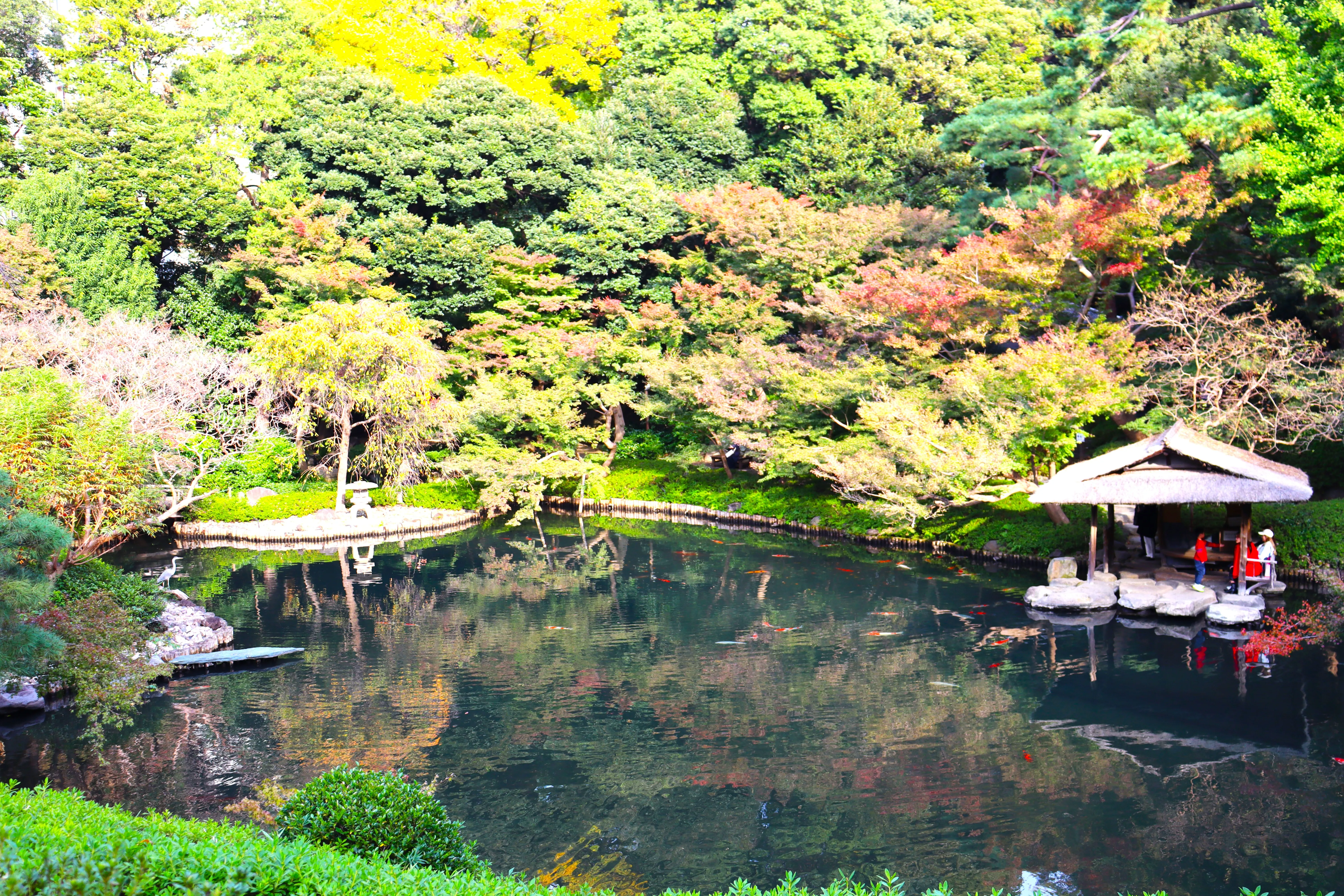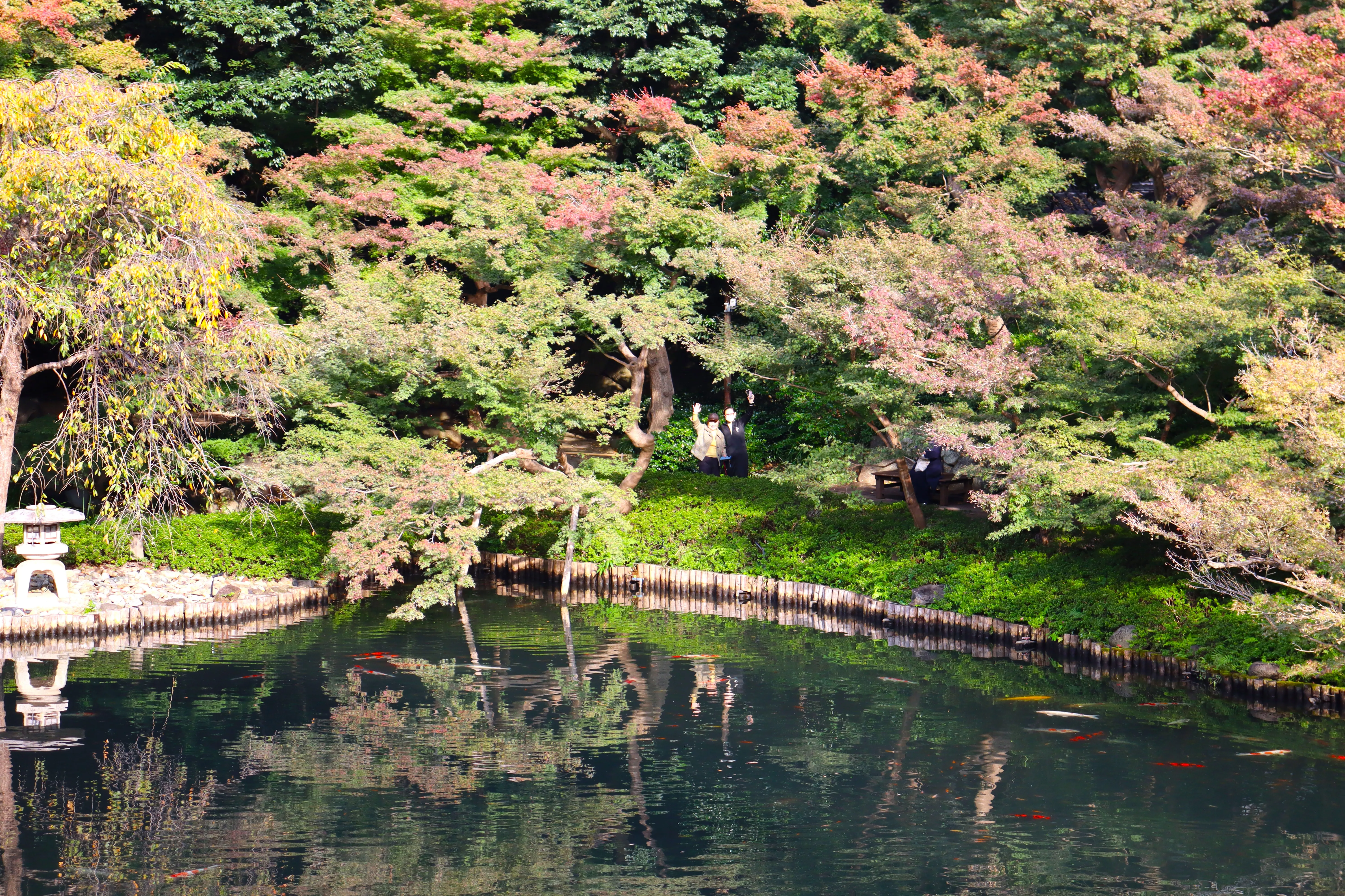 池の水面に映る紅葉と、池の錦鯉が色鮮やかで見事な眺めです。