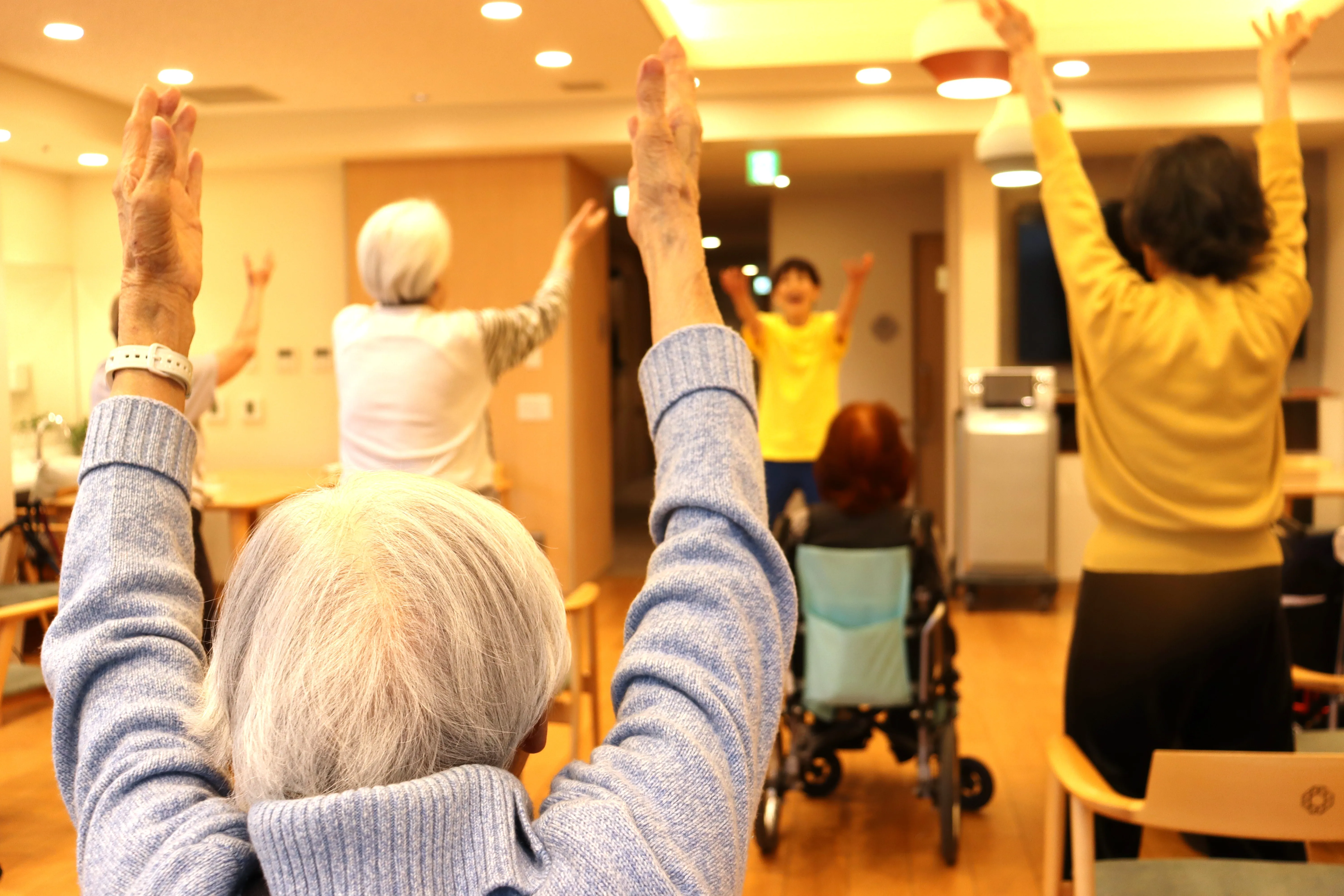 腕を高く上げたり、リズムに合わせてステップを踏んだり・・・。