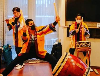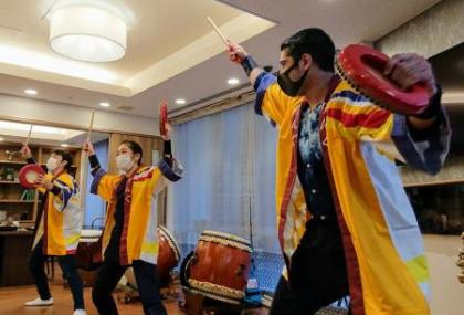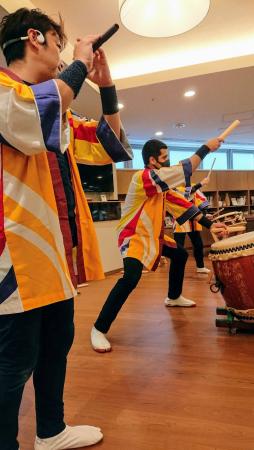 太鼓のバチを渡され、皆さんも太鼓をたたいてみると、、、思いがけず、大きな音が!