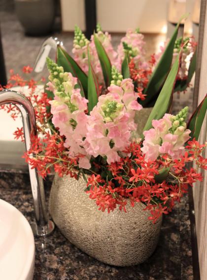 ご来設の方に手洗い・うがいのご協力をいただいていますが、洗面所にも新鮮なお花を飾り、香りと色でお出迎えしています。