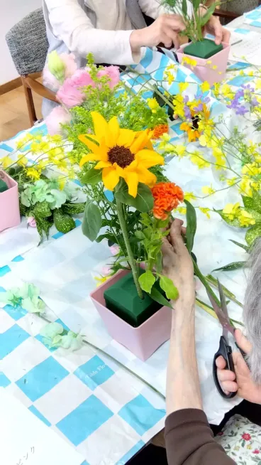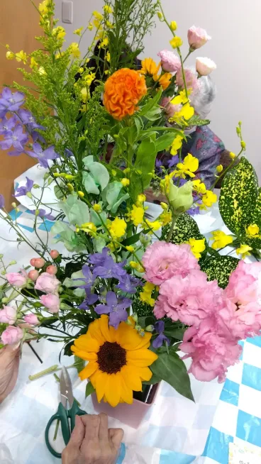 6月13日、お花の先生にきて頂き、季節の花々を使ったフラワーアレンジメントを開催しました。