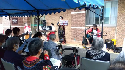 午後からは、ホーム長とゆかいな仲間たちによる野外ライブがスタート!華やかな衣装に身を包んだ出演者たちが登場し、いつものカラオケ大会とはひと味違う、まるでフェスのような盛り上がりに!!