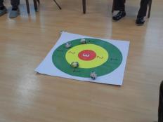 大きな用紙に的を作り、一人5球ずつ玉を投げて合計点数を競いました。