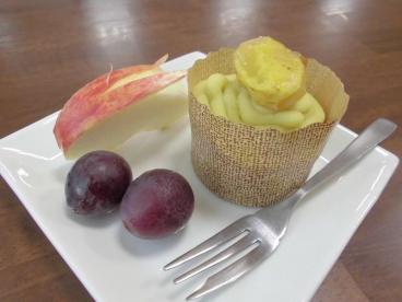 準備が出来たらカップケーキにサツマイモのクリームを絞り、フルーツも添えてオリジナルのモンブランプレートの完成!!