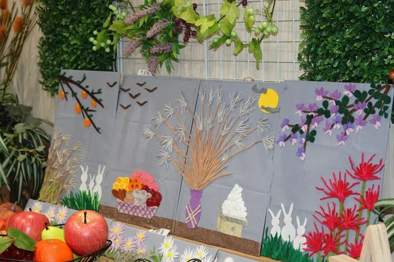 10月に入りエントランスの飾りが、彼岸花から十五夜に変わっていました。お団子と収穫物、ススキが飾ってあるそばで、お月見しているウサギさんが可愛い作品です。今年の十五夜は10月6日、まん丸お月様が見えるかどうか・・・