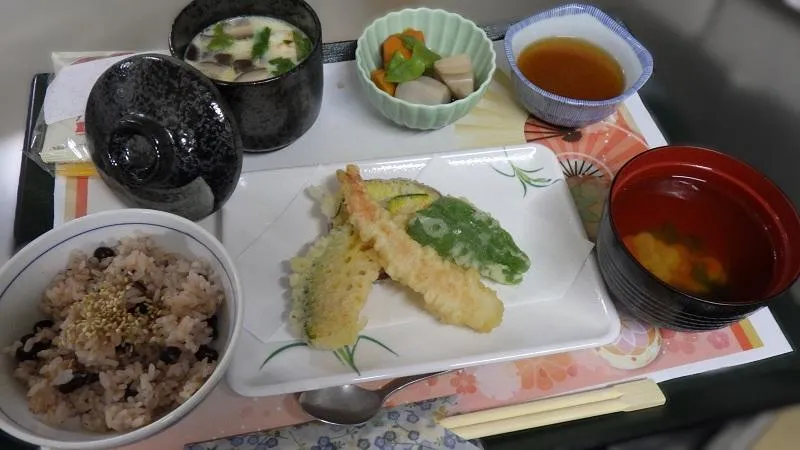 天ぷら盛り合わせ・煮物・茶碗蒸し・赤飯・すまし汁