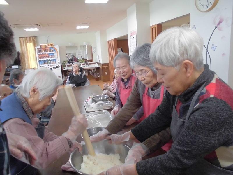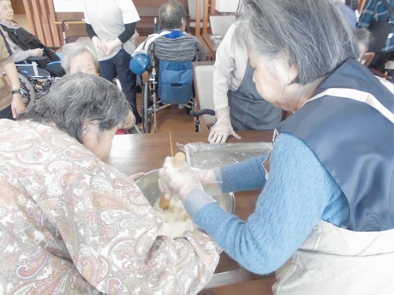 もち米を丸める班とそれにあんこを乗せる班に分かれて、作りました。