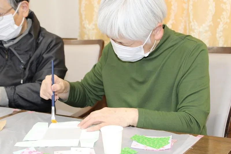 本日は工作クラブを行いました。今回は「小物入れ」の作成です。ベースの箱の紙に、そこに貼る紙を選びデザインしていきます。たくさんの種類の紙があったので皆様選ぶのに迷っている様子でしたが、綺麗に貼ってオリジナルの小物入れが出来上がりました。