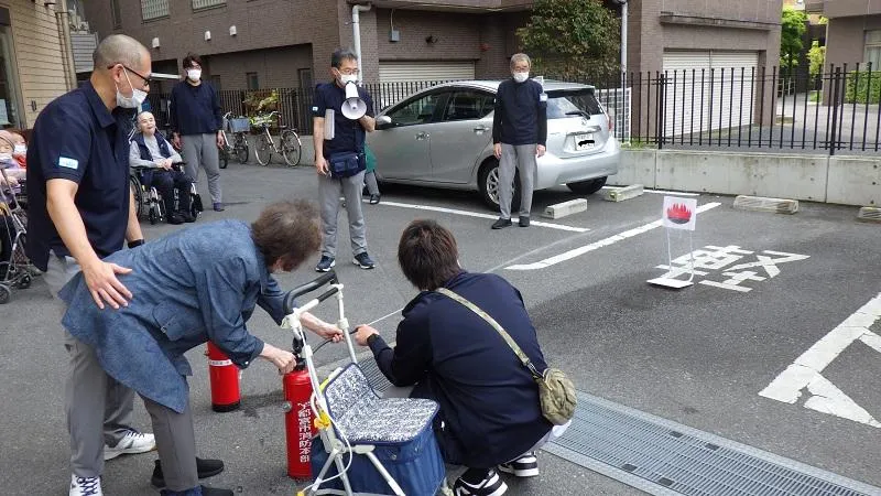 厨房からの出火の想定での訓練を実施。館内アナウンスに沿って避難開始!