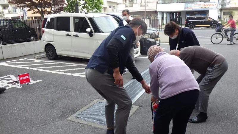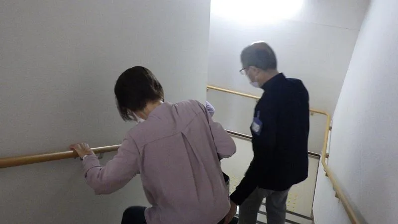 初めて参加のお客様は「階段は大変だわね」と、一生懸命に下りて避難していました。