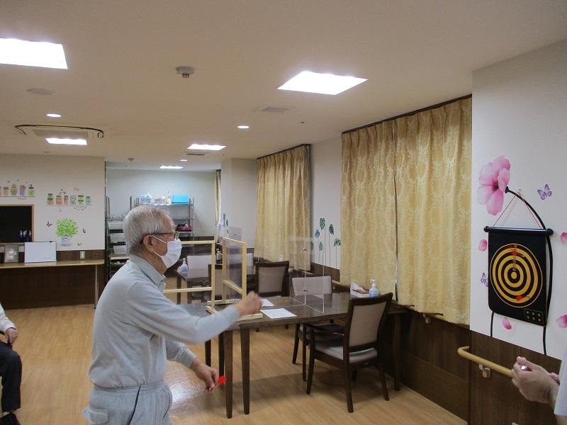 先月からレクリエーションの時間に、ダーツゲームを開催しています。1人6本投げて合計点数で勝負!2回戦目は、投げる距離をすこーし長くして挑戦です。なかなか思うような所に当たらずに皆さん一喜一憂。人気のレクリエーションになりそうです。